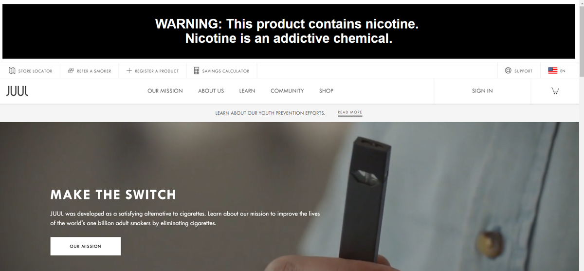 サンフランシスコには、電子タバコで急成長中のJUUL社が本拠を構えており、今後の動向に注目ですね。JUUL社のウェブサイトを覗いてみたところ、トップ画面の一番目につく場所に、「同社の製品にはニコチンが含まれており、ニコチンには中毒性があります」との文章が!!!!!ここまでしないとダメなんですねー。